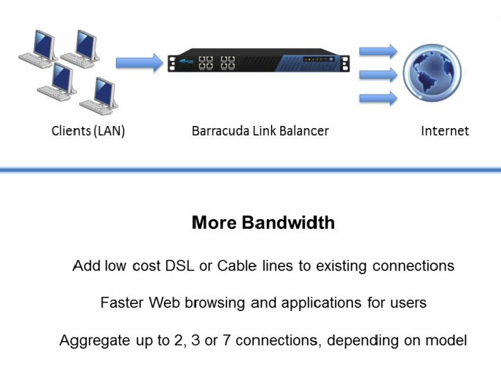 The Barracuda Link Balancer combines numerous features to ensure available bandwidth from Internet connections. Provides optimal access to multiple high speed connections while automatic failover ensures reliable connectivity to any of the available Internet links. The Barracuda Link Balancer prioritizes bandwidth to mission critical requests for Internet connectivity.